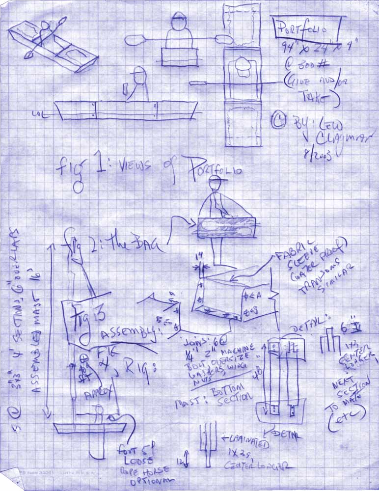 Portfolio in the basic version is a paddler, almost 8’ long and not very interesting as a boat form (see fig 1). Disassembled into three main modules and a few other items, it stows in a soft shoulder bag (see fig 2) which is 37x25x 7 inches. It stores in a closet and travels easily in an elevator and on the subway, all the way from The Village to the river or even to The Park, or even (I don’t tell people this) to The Island. The double-paddle disassembles into two halves, which stow in slots on the bag in the manner of tennis rackets. Gunnels are 3” ply strips, also of ¼” stock, glued in place. End pieces are 2’6” overall, with the waterproof fabric pocket transoms angled back 6” on the bottom; the middle pieces are 3’ long. Waterproof fabric pockets for bulkheads are placed one inch from all mating ends. Stiffeners, discussed below, are inserted in the pockets.
