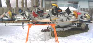 The Ryobi model #1551DXL (Editor's note: You can win this saw in our latest design contest. Thanks to John, the company donated it to Duckworks) comes with a laser kerf sight system called Exactline, a clamp and dust bag with a vacuum hookup. It also has sliding extensions for longer boards with an adjustable stop included. The blade was very surprising in the smoothness of cut it provided for the small amount of teeth that the blade has. With the low cost of this saw it would be perfect for someone who needed the capacity but didn’t want to break the bank. Freud graciously provided one of their 72-toothed 12” thin kerfed saw blades to use as an aftermarket test blade to see what a good blade could do for the saws I have for testing. With this blade mounted on the Ryobi 1551DXL and with the saw in perfect alignment, this saw could equal in exactness any cut of any non-sliding saw in this test. Although it could not match the size pieces that the other saw could cut, it was on the money as far as miter angle and smoothness. If you can’t afford a dual compound saw or a slider this saw is a perfect choice. For the student or person on a fixed income like myself this is a great saw. Even without an aftermarket blade I was amazed at the precise angled smooth cuts it produced. I give this saw a very high "must have" rating and with a great blade it is a superior saw at a discount price. It comes with all the options most high-end saws don't have included like material extensions and a clamp. I also have to mention that most high-end saws can also improve their blade quality to improve their cutting ability. The laser on this saw is a great addition that helps so much. You can never mistake where the blade will cut unless you have your eyes closed and I would not recommend that unless you want the nickname “Stubs”.