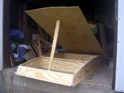 ...then I held the bottom down with my knee while I put a couple of drywall screws through it into the transom. That done, I propped the bow end of the bottom piece up so that I could caulk the rest of the mating areas: