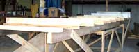 If you look carefully, you can see that this piece of ply (actually two pieces scarphed together) is marked with the shape of the bottom of the boat. This is the piece that will go on the strongback and on which the rest of the boat will be built. |