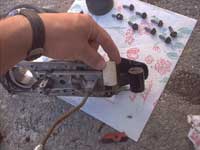 click to enlargeTaking the tank head apart requires nothing more than a largish slothead screwdriver. But those screws are REALLY tight, and soft enough that it’s easy to strip the head. They didn’t want to back out too well. TIGHTENING them slightly broke them loose, then they came out easily. Don’t lose the little hard rubber washers! Here it is coming apart.