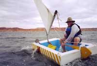 Fortunately about the time that Randy was beginning to show the merest signs of regret for the sailing time lost in this quest for the wayward boat, a Lake Powell Park Ranger boat came within hailing distance. The captain of that boat upon hearing my sad tale of woe and lost boats bid me to join him and continue the search in his vessel. Which was by the way powered by two, TWO HUNDRED HORSPOWER Honda outboards. I quickly took him up on his offer bidding Randy thank you, adieu and safe voyage.