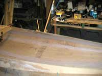 I had a tough time getting the plywood to bend over the deck area, so I made several lengthwise saw kerfs on the underside to relieve some of the tension. Even so, it still took a lot of pressure to get the plywood to bend around the curve of the deck beams, so I left the screws in along the sheer. I’d hate for it to come apart while I’m out on the water. That could REALLY ruin your day.
