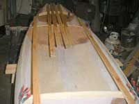 click to enlargeThis is the stock for the sheer clamps laying across the center of the hull. I was trying to get an idea of how to install the stringers to support the cockpit edges. I was laying the stringers out to get a visual sense of how they can be integrated into the framing.