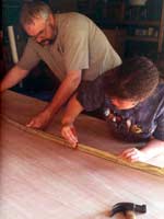 I bought fiberglass in a 110-yard roll, and needed to cut it into three-inch strips for the seams. I have a leg vise on a portable stand that I can move around the shop. PHOTO I attached a piece of 1” scrap to the bottom of a 1’x3’ piece of hard board, like the stuff counter top is made from, and drew a line down the hard board, three inches from the edge. PHOTO I made a stand from some more scraps 1” material for the fiberglass roll and pulled the glass off the roll onto the stand. We would cut several strips of fiberglass and then epoxy them. For the epoxy, I took a scrap of plywood, attached 1” scrap all around with sheet rock screws and used that to wet out the strips. PHOTO We made sort of a production line, one person cutting, another person wetting out the glass strip and my wife and I applying them to the seams. After we had filleted and glassed all the seams on the inside, we flipped the hull and went to work on the outside.