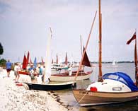 click to enlargeSeveral boats getting ready to leave Island Place hotel, the unofficial headquarters of the Cedar Key gathering. My notes say the catboat on the right is a Chappiquiddick 12 ½. (Yeah, I know everyone else spells it Chappaquiddick, but this is how it was on the sail.)