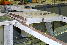 Additionally, this plank had been let into the beams—in other words the beams were cut away to allow the ¾” plank to lie fully beneath the plywood.  This had the net result of reducing the load bearing section of the beams from 1 and 3/8” to 5/8”—more than half the beam.  In actuality the beams had even been over cut and ¼” shims placed between the plank and beam.  Needless to say all beams had suffered breaks while weakness in the bows due to omission of the breast hook (the plank was toed in to a block screwed to the stem with nothing tying to the hull) was evident from numerous repairs to the stem.