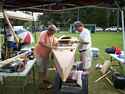 This was the building day for these boats. The teams are allowed a certain list of materials and come up with a boat of their choosing. There is a race on Sunday that requires traveling both upstream and downstream in the river. So, the boats have sails and oars/paddles. Some of the boats were crude but some were beautiful. Normally a parade is held from the building area to the race start. The teams pull/carry their boats to the river and usually decorate them and themselves. One time there was a Dixieland Band leading the parade. Great fun!