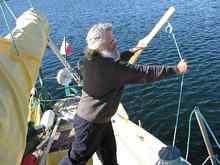 8. Draw in the lanyard from the tip of the loom sloping forward some 14º to the level of the yuloher's feet. We placed a eye bolt in the rear bulkhead at the deck level giving a forward angle that seems to be doing the job. I don't believe it is a full 14 º but it does work.