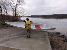 Potential refinements. I may add a couple more .75 x .75" skids on the bottom halfway between the keel and the chine for a little more stiffness. Another enhancement might be some crosswise 1x2 pieces glued and screwed to the inside of the bottom to stiffen the plywood where you side and keep your butt out of the cold water that finds its way in. I think you will definitely want a backrest thwart at any point where you are likely to need to rest your back. Perhaps one more thwart near the middle can serve as backrest for a solo paddler and the forward paddler, if the boat reverses direction for these two modes. However a moveable seat with a back might be the better approach, though this hull form does seem to be rather tolerant of bad trim.