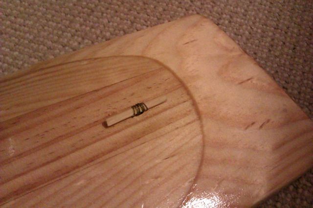 STOP. Don't glue together now like I did – remember to seal the inside surfaces of the sound chamber as getting a brush in there afterwards is nigh on  impossible. Then glue together (note the nail stopping things from sliding around). After gluing together finish off the shaping of the blade. The small hole is where the strings feed through to be tied to a short piece of a thick bamboo BBQ skewer. The strings will be held in alignment on the bridge by notches.
