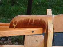 Frame 3 with the keel stringer inserted. Also, the frame temporarily screwed to a bracket screwed to a 2x4 block, screwed to the strong-back.