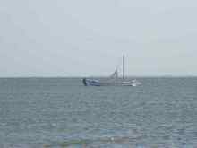 The ride across the  Bay was rough and at times a bit tense, so after threading Stingray Hole and turning east into the Ship Channel I wanted a break and the chance to have something for lunch that didn’t start with Clif and end with Bar. One of the great things about the Mayfly is that the weighted rudderblade and the auto release camcleat on the leeboard allow the boat to take care of itself when beaching.  I can find a beach and sail up to it and not worry about a thing but steering and working the sheet. Point of Mustang on the south side of the channel had a beach that looked like it fit the bill, so I headed over for a quick lunch and the opportunity to stretch my legs. I saw Ozey Pearl pass and within about 5 minutes of my arrival, a large catamaran (30’ ?) with some sunbathers in bikinis whose crew had seen me sail up to the beach tried the same trick and grounded hard about a hundred yards out. I had some pretty good entertainment for the first 15 minutes of my lunch, although the language I could hear would not have passed muster on TV anywhere but HBO.