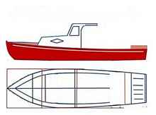 The sail rig didn't work out so well so I motored about for the rest of the event. Later in the fall I bought a trolling motor and battery and used her that way for the rest of the season. Having finally secured employment full time in the late fall I started thinking about the 2013 event. I wondered what I could do with the skiff to make it a little bit larger and more comfortable and perhaps able to take a larger outboard. I spent much of the winter drawing on the computer using the existing skiff as a basis hoping to come up with a design that would meet my needs for 2013. Since I am a native of Maine I thought a lobster boat replica might be kind of fun to have.