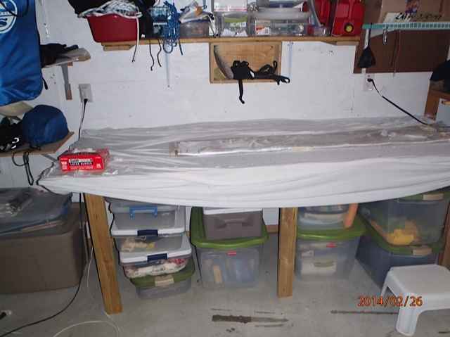 Note I have built cradles to secure the pontoons/outriggers and cut the cloth ready for glassing...