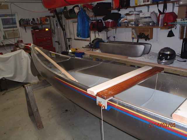 I've been going through a number of mockups in an attempt to determine just exactly how this all goes together. There are some basic guidelines to follow, keeping the leeboards close to the forward center of the canoe, determining the center of effort (CE) of the particular sail you're using, the CE basically determines the location of the mast/sail. There are other details concerning the mast step, on the older Grummans they came with two step tabs riveted to the keel. These were essentially based on the lateen and gunter rigs Grumman sold. The newer Grummans' don't have these tabs, nor does Grumman offer sailing options any longer (not since 1990). However, the tab is relatively easy to have fabricated and an appropriate mast step to mount on this tab. I'll go into more detail about the mast step once I get to the fabricator and have one made. Materials for the thwarts are not difficult to find, and there are many options. I started with 1x4 and 1x6 oak, but have switched to spruce particularly for the leeboard thwart. The leeboard thwart will have a lot of stress on it, so it's important to have a strong structure. It's also important to design the leeboard thwart so it can be moved for adjusting balance. It doesn't have to move very much, 3 or 4 inches is usually sufficient. I'm using metal home made clamps that came with the Grumman lateen sailing components I purchased used. The mast thwart can also be clamped on, but I will mount mine to the railings, thru bolting. I'm using stainless steel fasteners and aluminum or bronze parts to avoid corrosion issues. I'll make comments on each photo: