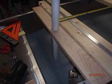 Using a wood mast step and a 1 1/2" PVC pipe for aligning, you can see the thwart placement. There is another option for the mast step, removing six keel rivets and having a step fabricated to bolt in place. The advantage of using a bolt in step is it can be removed and/or relocated by removing rivets and thru-bolting to the keel. The obvious disadvantage of marietexing the step in place, it's extremely difficult to remove. I'm undecided which I want to use. The mast thwart is 1x4 oak, although I have a section of 2x6 spruce which would match the leeboard thwart. The 1x4 oak middle board represents the location of the pontoon strut.
