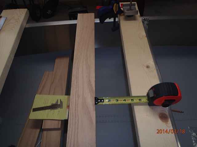 This is the oak 1x4 strut for attaching my two pontoons (I call them toons for short). I originally planned to use two struts, but the toons only weigh 11lbs each and a single strut should be strong enough. For good measure I will add a 1x2 screwed and epoxied strong back to this strut. The measurement of 5 inches is the distance forward of the leeboards this strut will be located (thru bolted to the railing). We need 5 inches clearance for the leeboards to rotate up and down.
