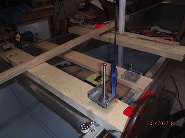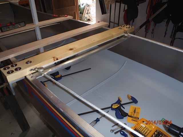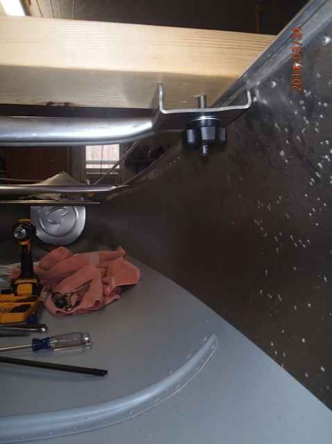 This is the leeboard thwart. I cut this from a spruce 2x6x8 from Lowes (it took some time to find a decent example). I ripped it down to fit the aluminum angle braces used for the leeboard support brackets. These brackets will be thru bolted. Notice the leeboard brackets are inverted to lower the weight and obtain maximum depth when lowered. Also note the home made clamps, these will be thru bolted with a fender and lock washer on top with the thumb screw knob underneath. This arrangement provides the best low profile for the leeboards. The factory thwart will be removed.
