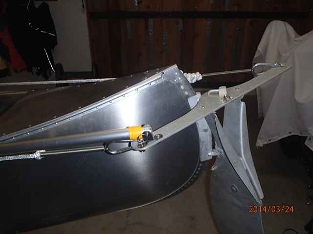 Using U-joints and a painters extension pole, I mounted both the line and tiller steering. Note spring attached to line and carribeaner. I can use either a tiller or line steering, although I think the line steering makes more sense.