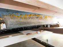Back to the barn.  And, back to the drawing table.  It was running pretty solidly from someplace in the toe of the keel stub.  Outa’ sight behind a rotted old plywood partial bulkhead.  Up where I kinda’ wondered about when I was splayed uncomfortably under the trailer frame attempting to glop ‘pox and heavy bi-ax cloth into a keel bottom shoe.  Up there, someplace.