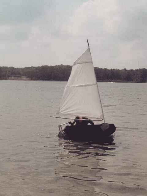 The boom needs to be aluminum tube, clew needs better lashing, but course holding and way on in wind from sparrow flying across lake.